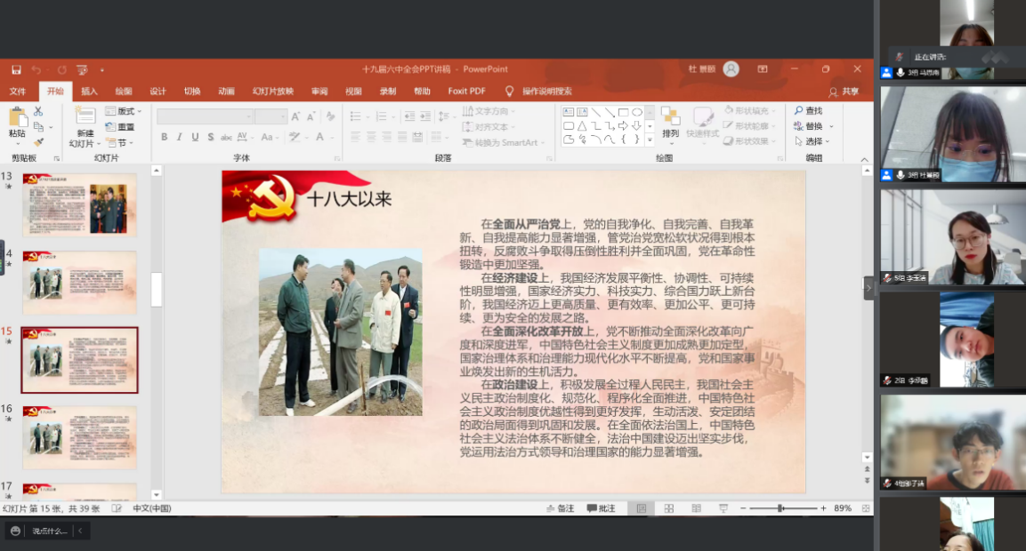 首先,杜景颐以PPT的形式带领全党支部同志共同学习了十九届六中全会的相关内容及精神。之后,依次介绍了会议概况、百年奋进的重大成就、会议亮点和百年奋斗的历史意义与经验四部分内容。接着,结合三个视频回顾了从1921年到改革开放以及十八大以来中国共产党如何带领人民从新的实践和时代特征出发坚持和发展马克思主义、形成中国特色社会主义理论体系和实现了马克思主义中国化新的飞跃的历史进程,并在十九届六中全会的会议亮点方面,主要介绍了习近平新时代中国特色社会主义思想,以充分的实践论证了全会为什么要明确强调“两个确定”。最后,重点分享了中国共产党百年奋斗的历史意义与经验,以及百年奋斗创造的四个伟大成就。
