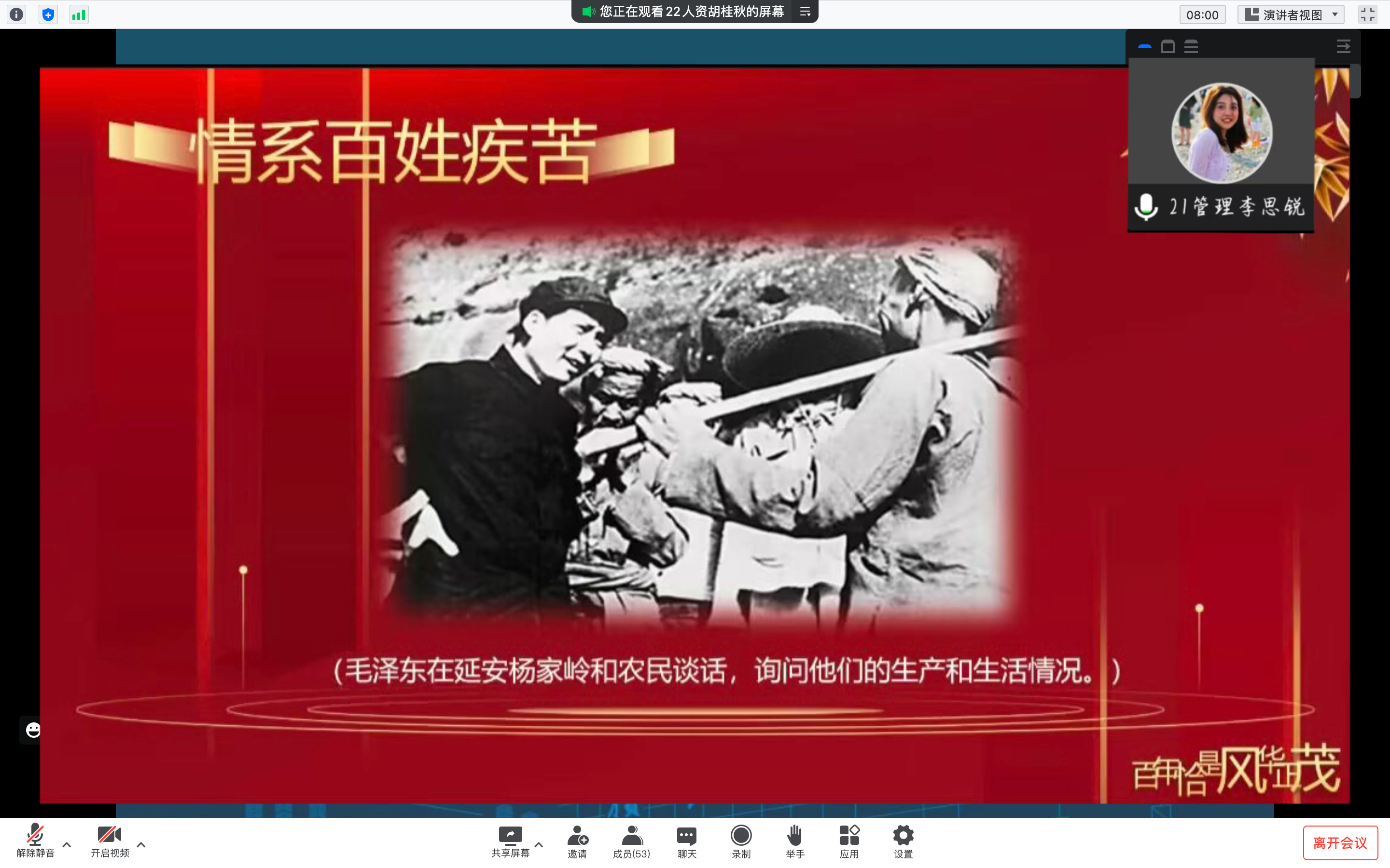 李思锐详细讲述了毛主席在延安革命根据地关心当地农民生产和生活,与百姓过同样艰苦的生活等事例,启发同学们从中体悟毛主席以人民为本为人民服务的伟大情怀。随后,她结合大家的学习和生活,鼓励大家不仅要重视专业知识的学习,也要积极参与政治理论学习,在学习事迹、感悟精神中锤炼品德修为涵养高尚情操。