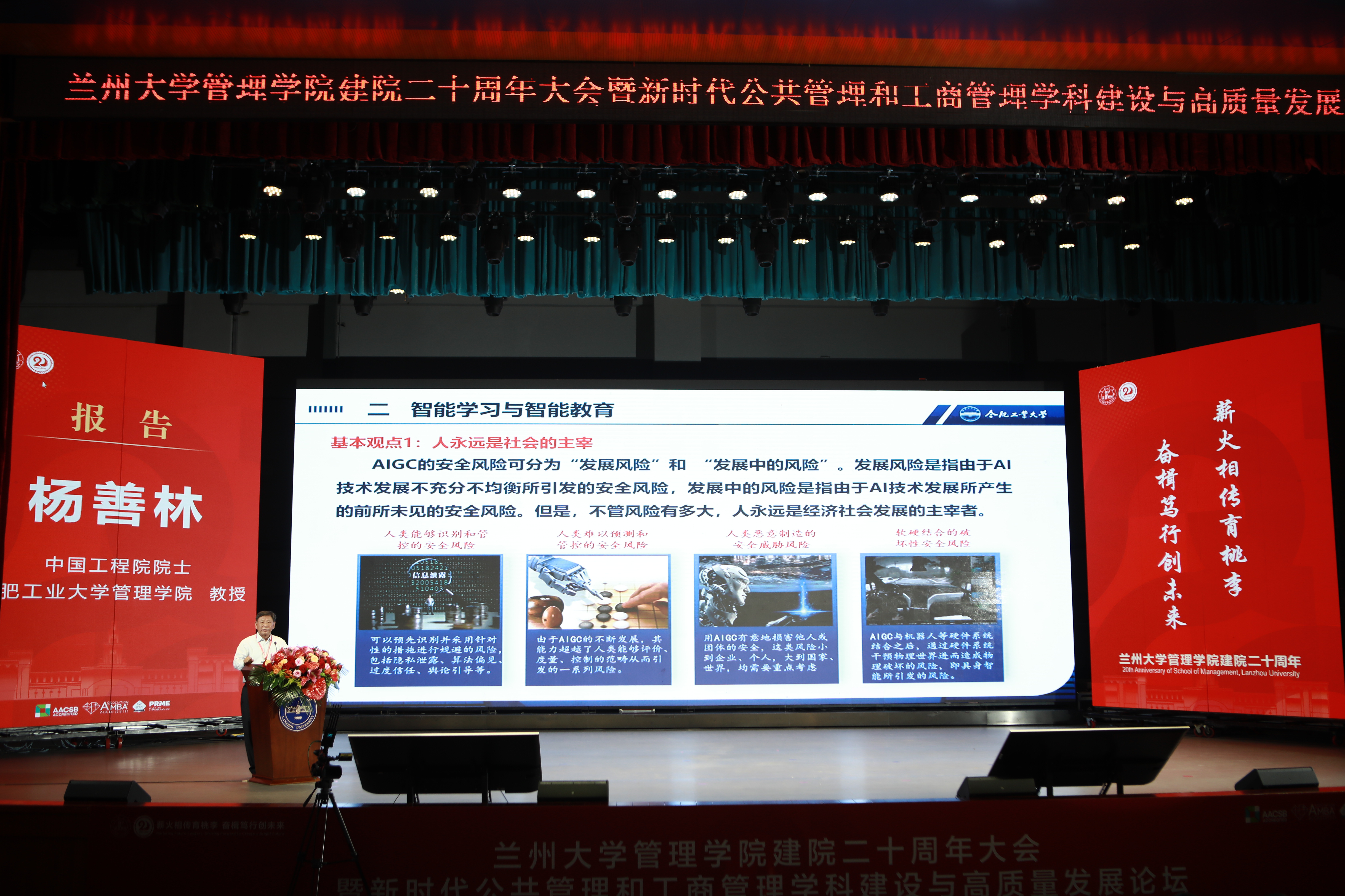 会后举行了人工智能与管理教育深度融合院长高峰论坛。杨善林教授作了题为“AIGC与教育变革的思考”的主旨演讲,他从生成式人工智能(AIGC)应用与发展、智能学习与智能教育两个方面,全面阐述了AIGC在科学发现、技术发明、产业发展、社会治理、智能代理等诸多领域的应用,以及未来AIGC在智能学习与智能教育方面应用的基本观点和教育场景,为生成式人工智能深刻改变形塑人类教育模式勾画了可能的图景。