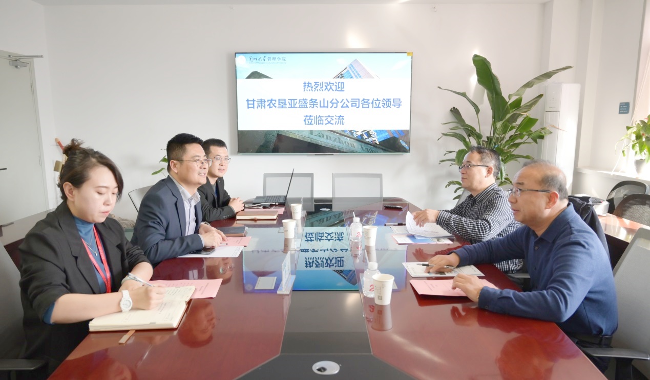 11月26日下午,甘肃农垦亚盛条山分公司一行到访管理学院,在齐云楼举行合作座谈会。甘肃农垦亚盛条山分公司党委书记、经理牛济军,人力资源部部长胡学英,兰州大学管理学院党委副书记、副院长常韬,EDP项目办公室秘书李璇、白有民参会。