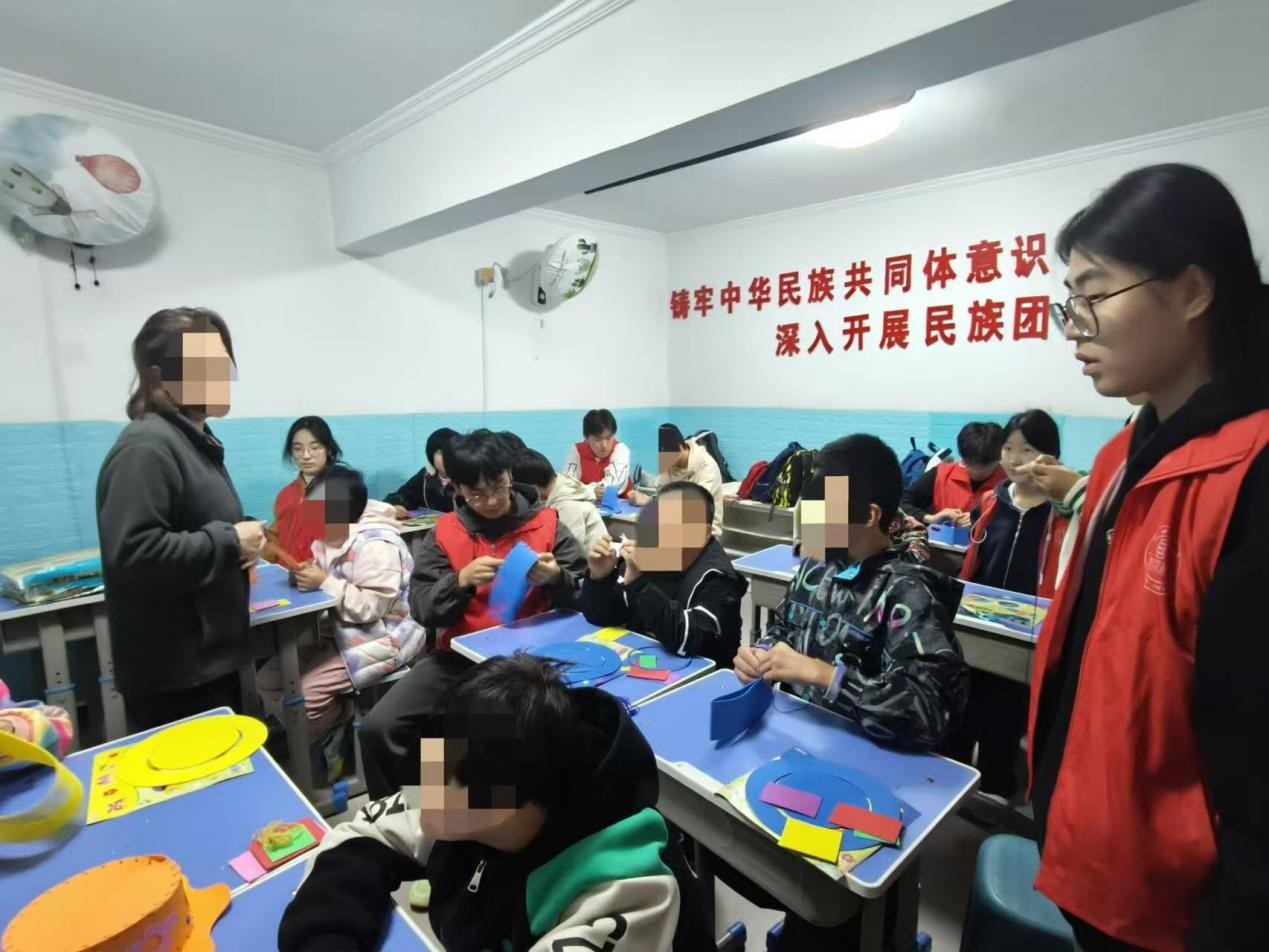 首先,志愿者们带领孩子们进行了一些趣味手工活动,以此激发他们的兴趣。面对一些难以专注的孩子,志愿者们并没有急于求成,而是耐心地引导和鼓励他们。渐渐地,这些孩子也被吸引到活动中,开始享受手工制作的乐趣。在志愿者们的帮助下,孩子们逐渐掌握了技巧,并能够与志愿者们合作完成作品。在志愿者们和孩子们的共同努力下,一顶顶五彩斑斓的小帽子诞生了,它们被戴在孩子们和志愿者的头上,教室里洋溢着欢声笑语。本次活动不仅锻炼了孩子们的动手能力,还让他们在互动中提升了情绪感知力。