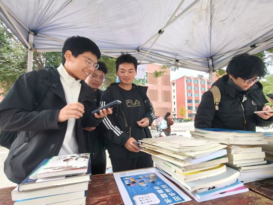 桌前围了不少同学:有人抱着刚从宿舍整理出的专业书,轻轻放在“捐赠区”,对着志愿者笑着说“这些书我用不上了,希望能帮到需要的人”;也有人蹲在书架旁,手指划过书本慢慢挑选,偶尔和身边同学小声讨论“这本管理学笔记好像很实用”。阳光落在标有“旧书漂流”字样的横幅上,连带着同学们翻书的指尖、交换书籍时的笑脸,都裹上了一层温柔的暖意。捐赠书籍的同学,有的选了志愿积分,说想为自己的志愿履历留下宝贵的记忆;有的接过小巧的纪念礼品,小心翼翼装入口袋里,说“这是参与活动的小纪念”。