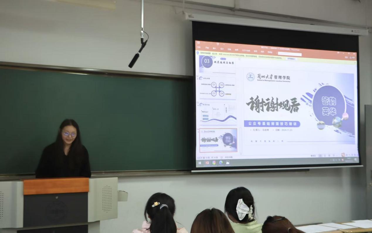 为进一步规范新媒体运营中的排版设计和视觉呈现,助力学生掌握新媒体技能,提升学生工作宣传质效,11月23日下午,管理学院学生会在天山堂A406教室顺利开展了第十四期青马干训活动。本次培训特地邀请了媒体发展中心新媒体运营部负责人马佳琳担任主讲人。学院全体团学组织负责人、成员,学生事务团队成员与各班级班委共同参与。