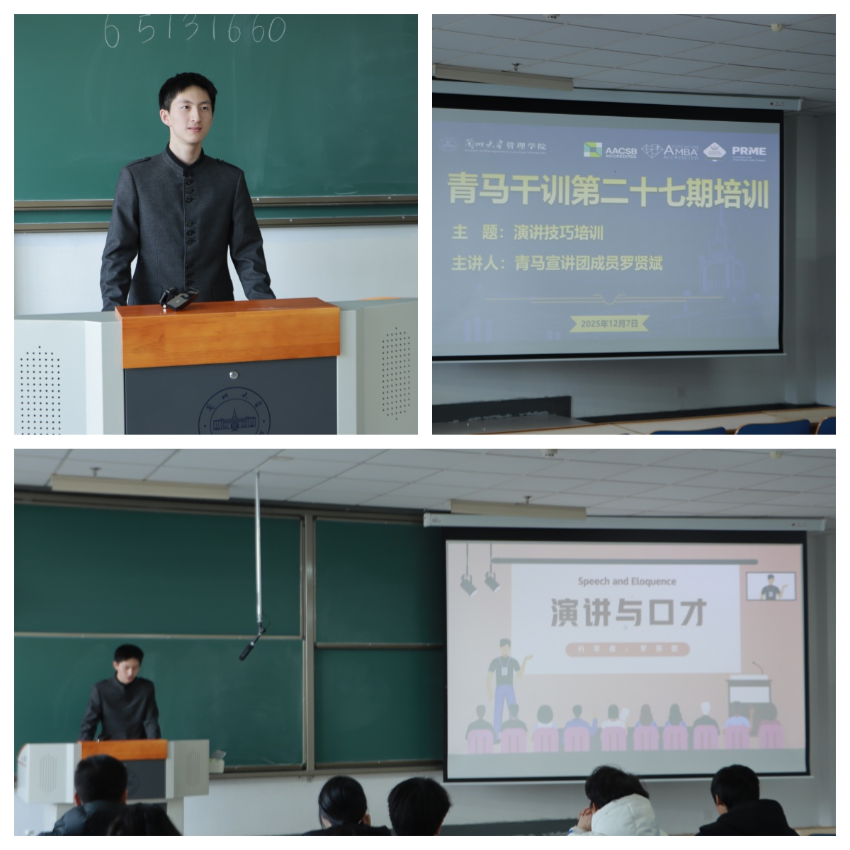 为进一步提高青年骨干的沟通与表达能力,助力青年学生以语言为载体,用演讲传递青年声音,12月7日,管理学院学生会在天山堂B402成功举办了第二十七期青马干训活动。本次培训特邀兰州大学“青马”宣讲团成员罗贤斌同学担任主讲。学院全体团学组织负责人、成员,学生事务团队成员与各班级班委共同参与。