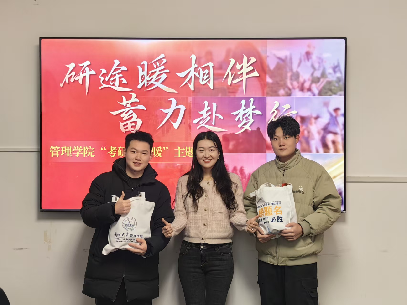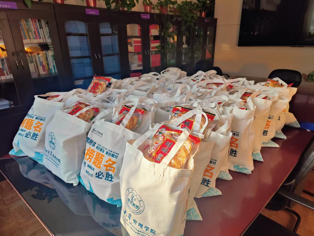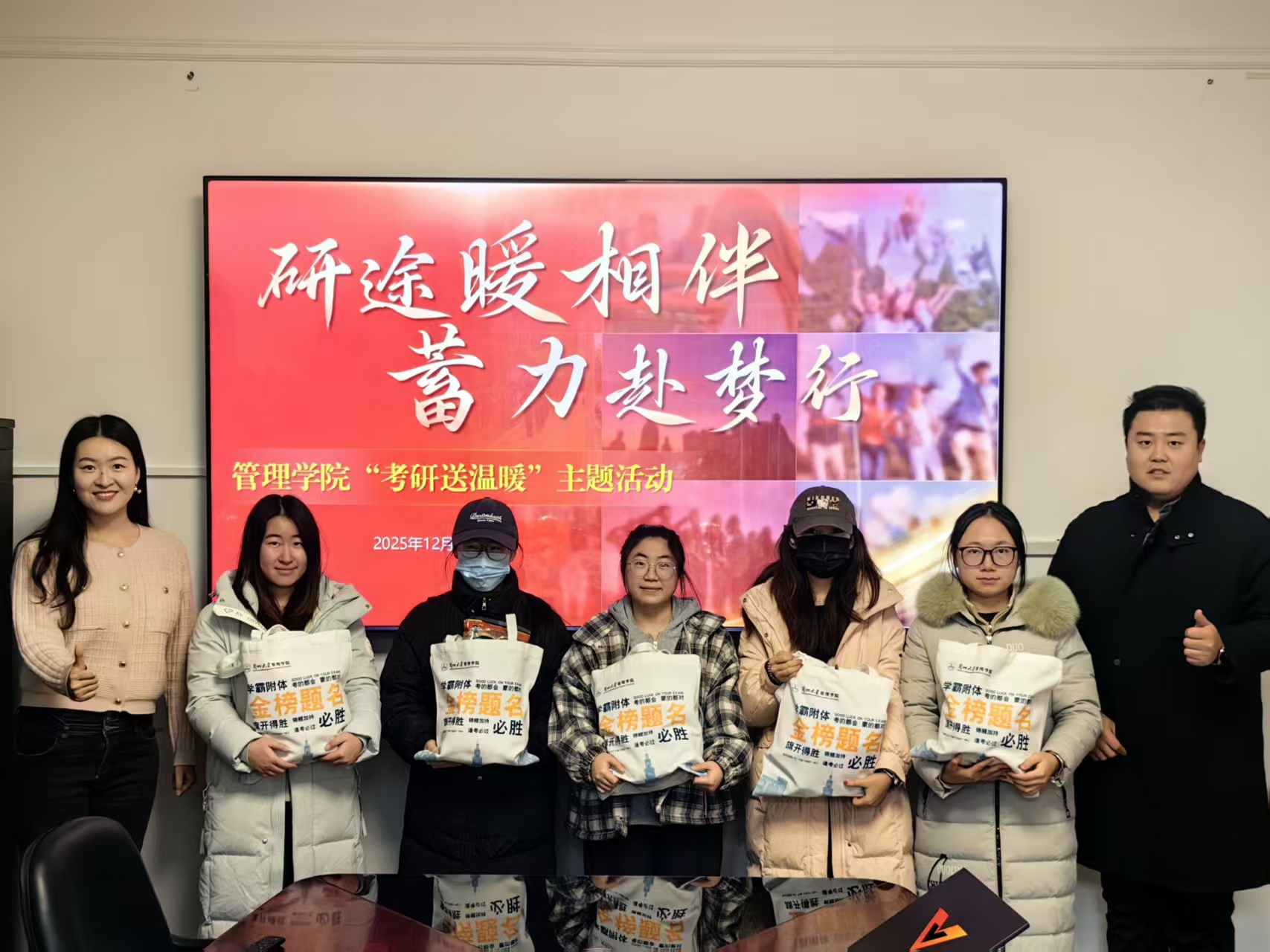 从晨光熹微到星光璀璨,从盛夏蝉鸣到寒冬落雪,考研学子们以笔为剑、以梦为马,在逐梦征程上奋力拼搏。为帮助学子们缓解备考压力、坚定冲刺信念,12月12日下午,管理学院开展“考研送温暖”主题活动,学院老师与学生干部代表共同为即将奔赴考场的2026届考研学子送上精心筹备的“考研加油包”与真挚祝福,用温情为追梦之路保驾护航。