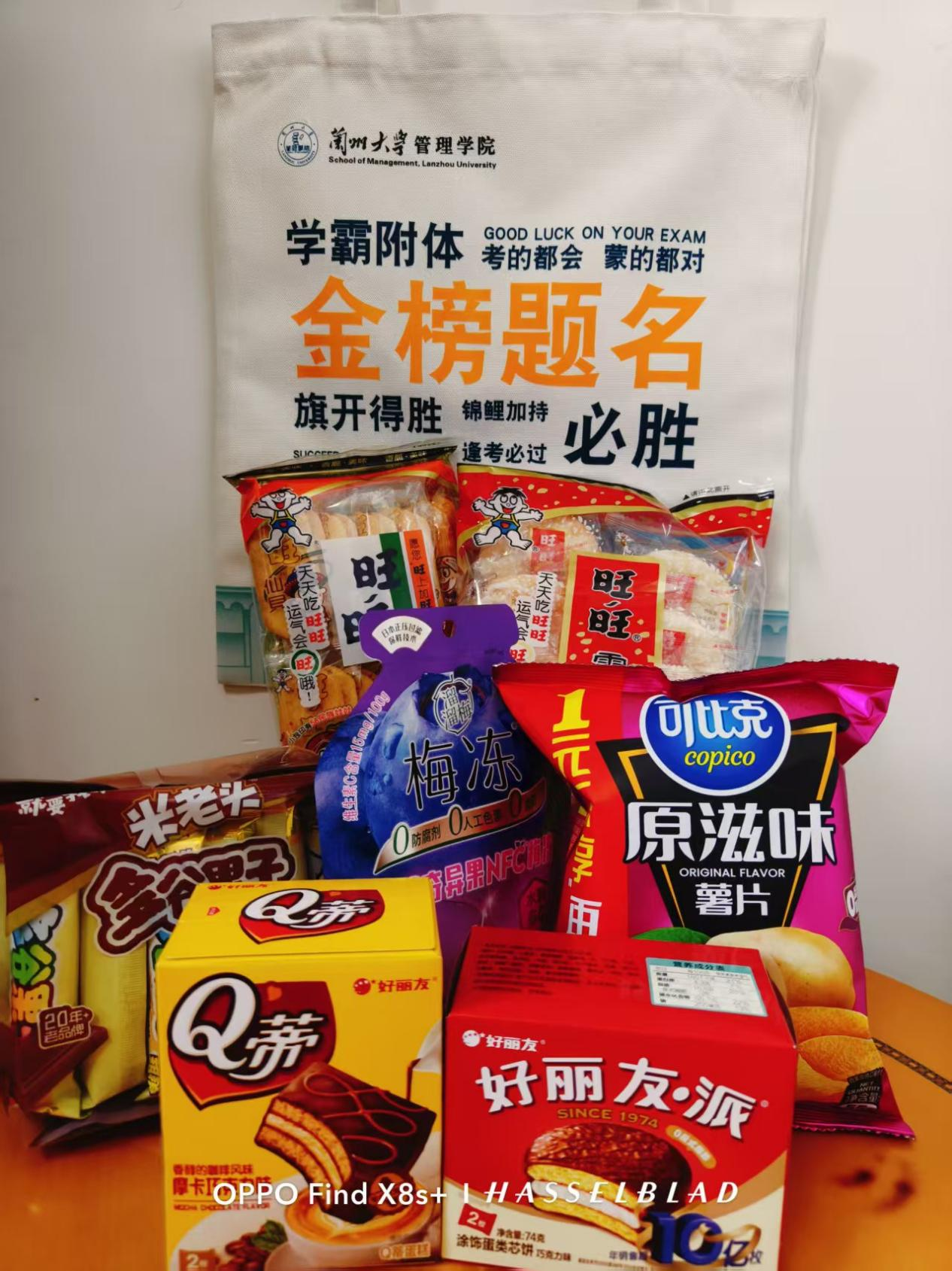 本次送出的“考研加油包”暗藏巧思、诚意满满。定制的包袋以“金榜题名”为中心,周边印着“旗开得胜”“锦鲤加持”的激励标语,呼应着学子们对成功上岸的期盼。打开加油包,各类零食整齐摆放:舒缓压力的好丽友派、补充能量的米饼仙贝与香甜可口的果冻等,每一份零食都经过细心挑选,既为学子们高强度的备考时光补充能量,也传递着学院的贴心关怀。